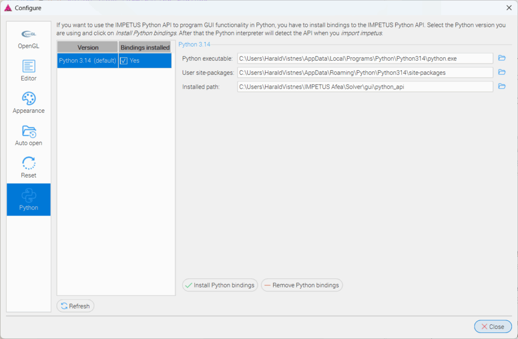 We have also made it a lot easier to get started with the Python API. To register the impetus module to your Python environment, simply go to File->Options->Python and click Install Python bindings. After that the Python interpreter will detect the API when you do import impetus.