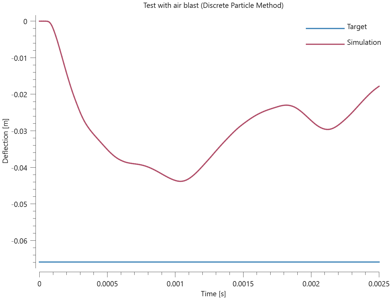 The aluminium target plate is modeled with material parameters from the referenced article and the frame is modeled as elastic with steel properties. The air and explosive charge are modeled with a total of 500 k discrete particles. Quarter symmetry is utilized to reduce the computational time.