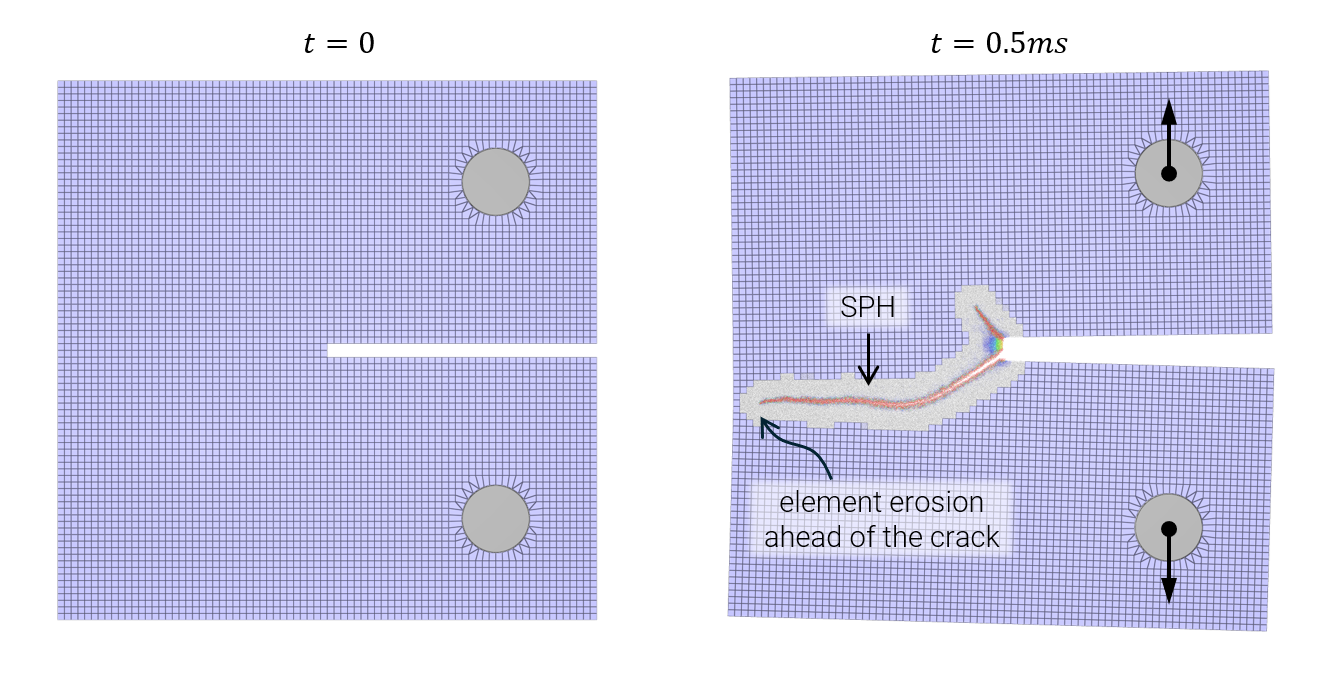 A model of a simple fracture toughness test specimen. Elements are eroded as the crack grows. Note that the SPH nodes have a residual strength even after reaching full damage (res_SPH$=0.01$). This prevents a local disintegration of the material along the crack.